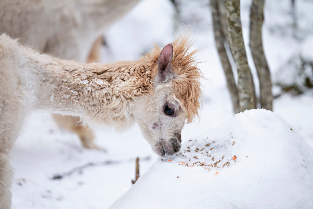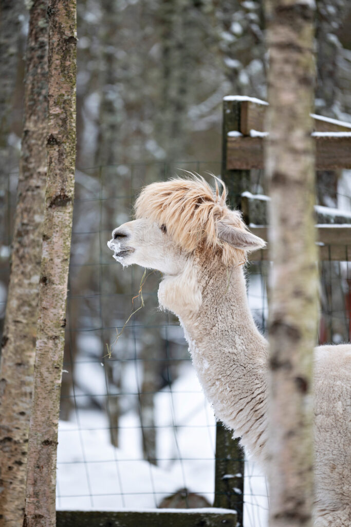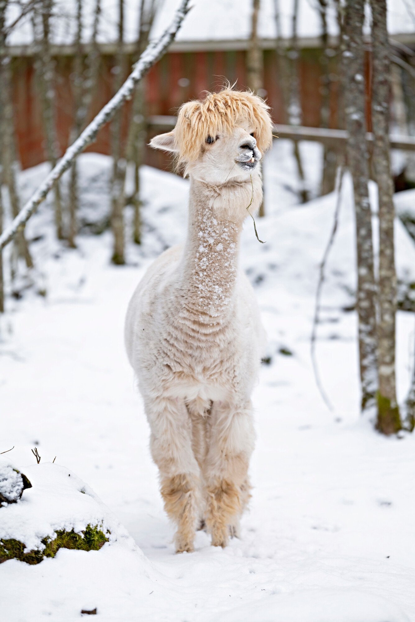 Fantasiaeläintäkin ne muistuttavat, sillä nämä kaunottaret saavat talvisen metsämaiseman muuttumaan jotenkin taianomaiseksi. Alpakat katsovat suurilla silmillään uteliaina, mutta samaan aikaan valppaina. Vartija-alpakka Hulda on kaikkein valppain. Se tarkastelee tilannetta korkeahkon kiven päältä, jolle se hyppää ketterästi kuin vuorikauris.