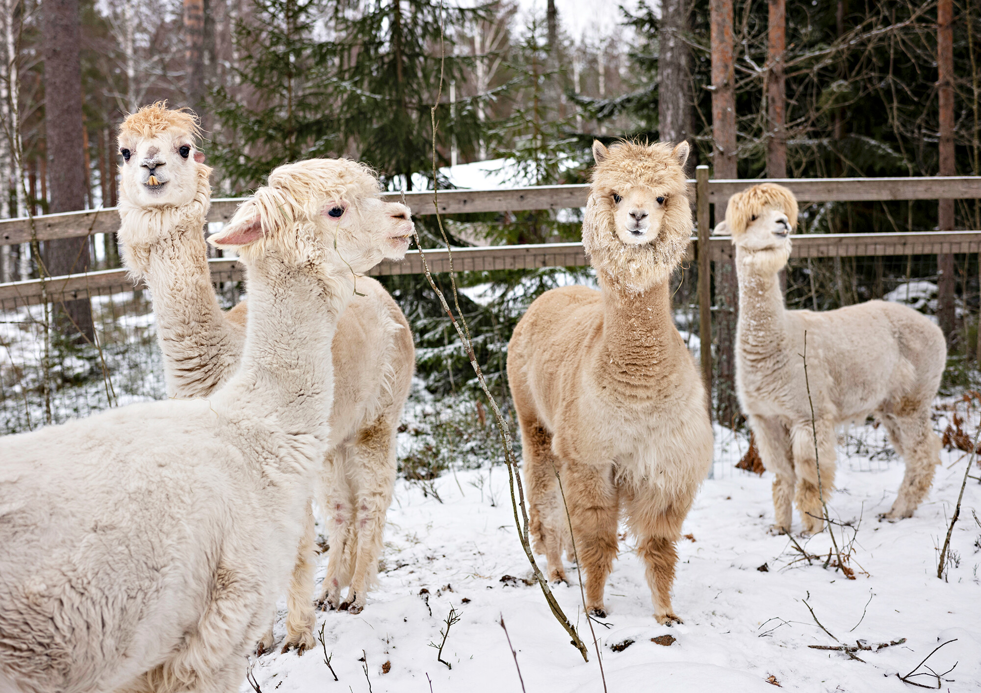 Alpakan pelkkä olemus rauhoittaa. Ne ovat ihan kuin joitain fantasiaeläimiä! Tai strutseja. Loviisan Villitarha-alpakkatilan Hulda, Halla, Pirtelö ja Saniainen katsovat tulijoita suurilla silmillään pitkät kaulat ojossa. Alpakkatilallinen Katriina Mähönen kertoo, että aikoinaan hänen alpakoitaan ihan oikeasti luultiin strutseiksi, sillä onhan niillä pitkä kaula, pitkänomainen turpa ja ”höyheniä” otsalla.