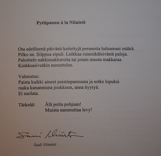 Kirjasen tunnetuin – ainakin nykyisin – on Suomen Tasavallan Presidentin ohje: Pyttipannu a’la Niinistö. Ohjeen ehkäpä tärkein kohta on reseptin lopussa: