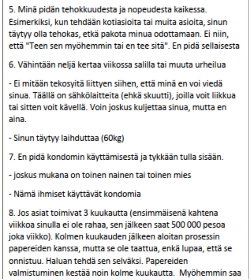 Kun Helsingin poliisin ihmiskauppatutkintaan erikoistunut ryhmä kävi läpi miehen tietotekniset laitteet, sieltä löytyi kolumbialaisille naisille kirjoitettu espanjankielinen vaatimuslista. Siinä mies esitti naisille pitkän liudan vaatimuksia.