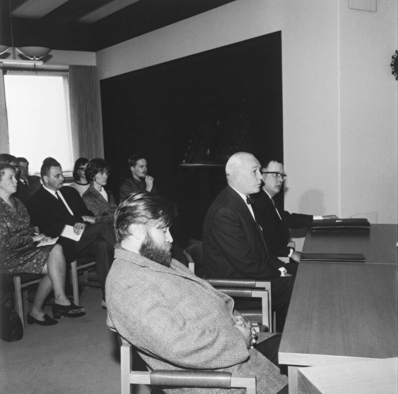 Hannu Salaman Juhannustanssit -kirjasta käytiin oikeutta 1960-luvun Suomessa. Kirjailija Salama hovioikeuden istunnossa, vierellään kustannusyhtiö Otavan Kari Reenpää ja asianajaja Heikki Borenius., LEHTIKUVA / PERTTI JENYTIN