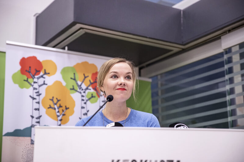 Keskustan puoluetoimisto Aurorankadulla. Katri Kulmuni pitää puheenjohtajan linjapuheensa.