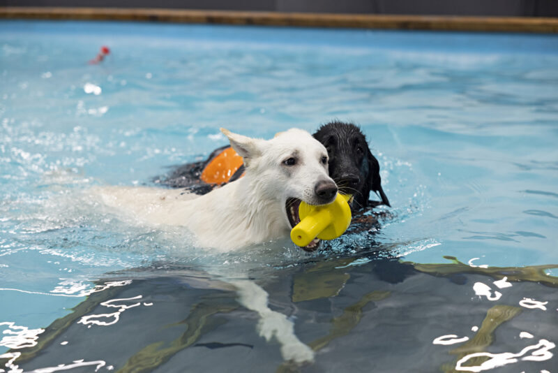 Kun katsoo Muskan ja Helkan intoilua altaassa, ei voi muuta kuin hymyillä. Niillä on lempilelut mukanaan, ja Ilona viskelee niitä koirilleen polviaan myöten vedessä.