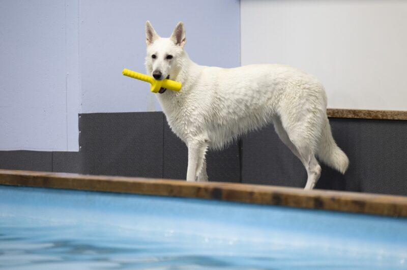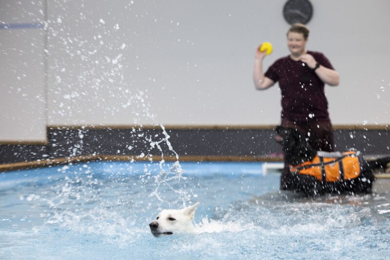 ”Yleensä koirat osaavat uida luonnostaan, mutta kaikki eivät halua. Voi käydä niinkin, että omistajaa ja koiraa jännittää ensimmäisellä kerralla, eikä uiminen onnistu. Usein kuitenkin muutaman käyntikerran jälkeen koira astelee jo itsestään veteen. Ramppia pitkin pientenkin koirien on helppo nousta vedestä ylös. Omistaja voi myös auttaa koiraa hihnasta altaan ulkopuolella”, Laura huomauttaa.