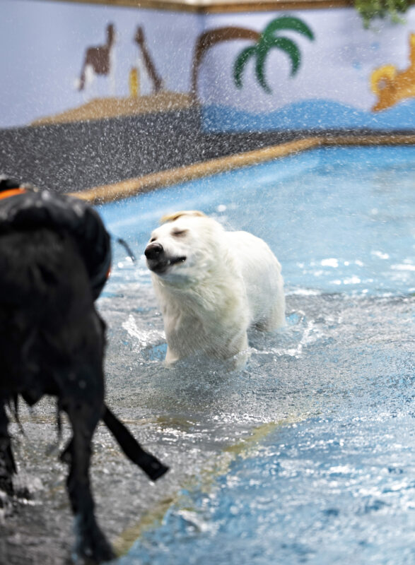”Koirat tulevat uimaan tyhjällä vatsalla ja niitä käytetään ulkona ennen uintia. Sitä paitsi koirat eivät pissaa tai kakkaa liikkeessä ollessaan, rekikoiria lukuun ottamatta. Jos näin käy, joudumme tekemään veden shokkikloorauksen, ja allas suljetaan joksikin aikaa”, Eevi ja Laura kertovat.