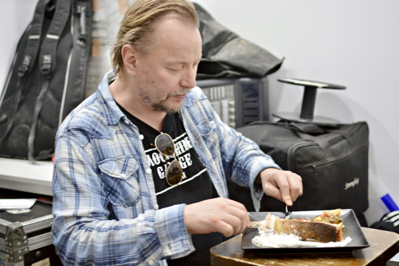 Muusikko Pauli Hanhiniemi, 60, nauttii päivällistä Espanjan Fuengirolassa sijaitsevan Ravintola Kukon bäkkärilla ennen illan keikkaa. Ankeassa muutaman neliön kokoisessa varastohuoneessa ilma meinaa loppua kesken ja glamour on kaukana.