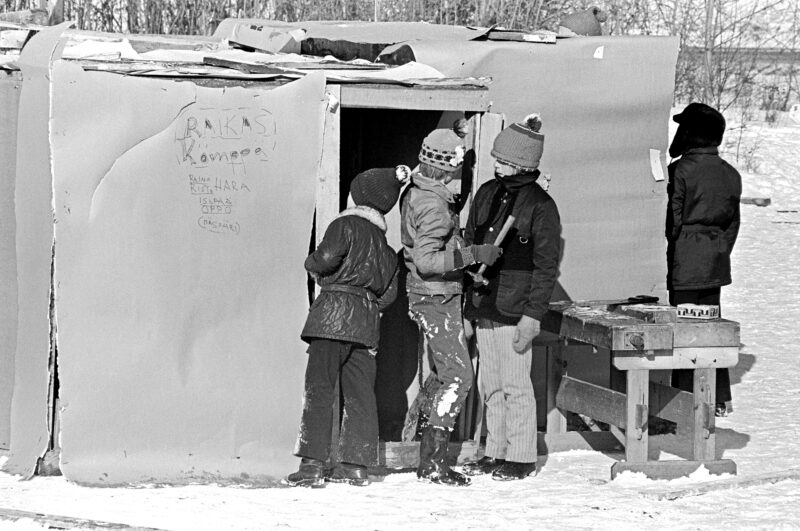Pirkkalan kouluissa pyrittiin kahden viikon ajan välittämään kansainvälisyyskoulutuksen avulla oppilaille totuudenmukaista maailmankuvaa 1973. Oppilaat ihmettelemässä yhdessä rakennettua hökkelikylää., ESKO SALA / HS / LEHTIKUVA