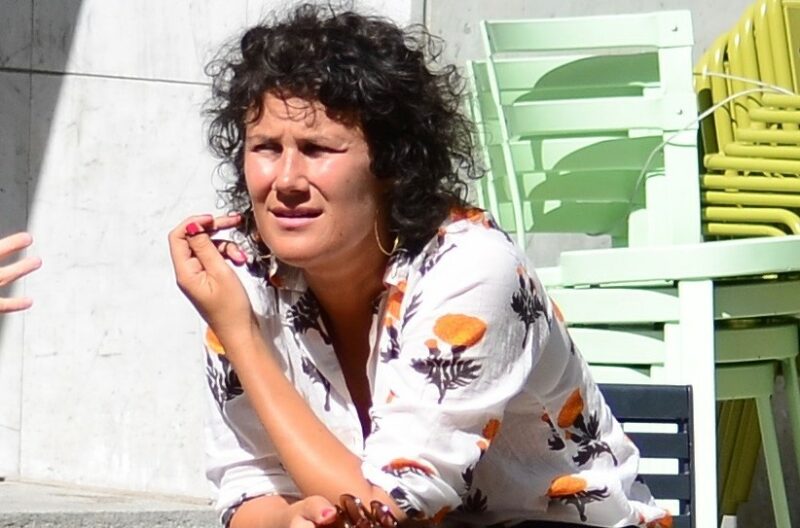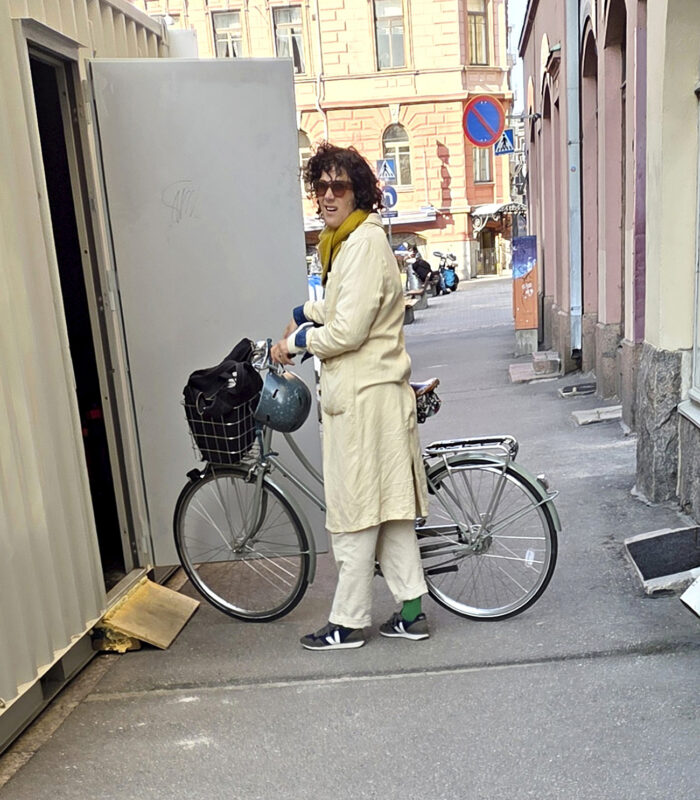 Näyttelijä Minttu Mustakallio talutti polkupyöränsä säilöön väliaikaisena varastotilana toimivaan konttiin Helsingin Punavuoressa.