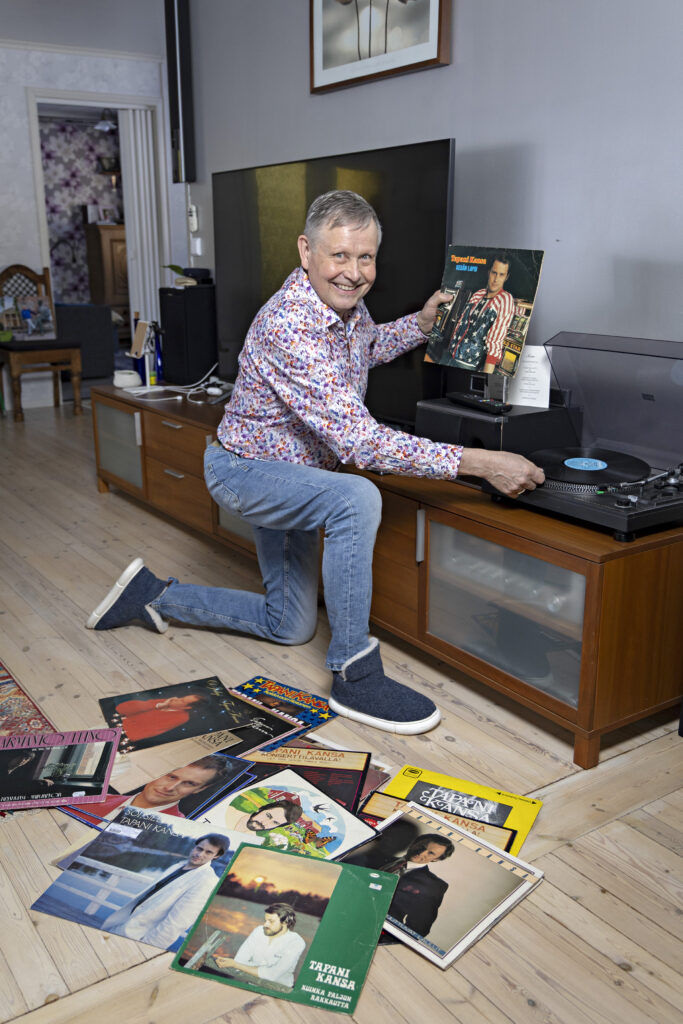 Olohuoneessa paraatipaikalla komeilee laulajalegenda Tapani Kansan kuva kehyksissä. Seppo Kansa, 69, nappaa Kotkan kotinsa seinältä kuvan käteensä. Kaapin kätköistä hän kaivaa esiin viime vuonna 76-vuotiaana edesmenneen isoveljensä vanhoja vinyylilevyjä.