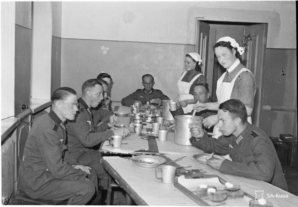 – Saksalaisupseerit olivat kuitenkin kovia juhlimaan. Tarjoilun täytyi olla ensiluokkaista ja viinaakaan ei saanut loppua. Minäkin sain osuuteni herkuista. Söin hyvin, mutta alkoholiin en koskenut. Tarjolla oli paljon parempaa, kun saksalaisnaiset antoivat minulle aitoa maitokaakaota.