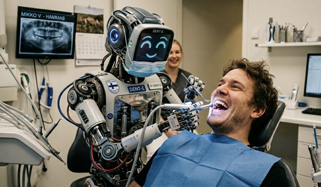 Helsingin kaupungin ensimmäiset täysin tekoälyn ohjaamat robottihammaslääkärit aloittivat tänään työnsä. Vastaanotolle pääsee jo tänään – kunhan muistaa hymyillä koko hammashoidon ajan.